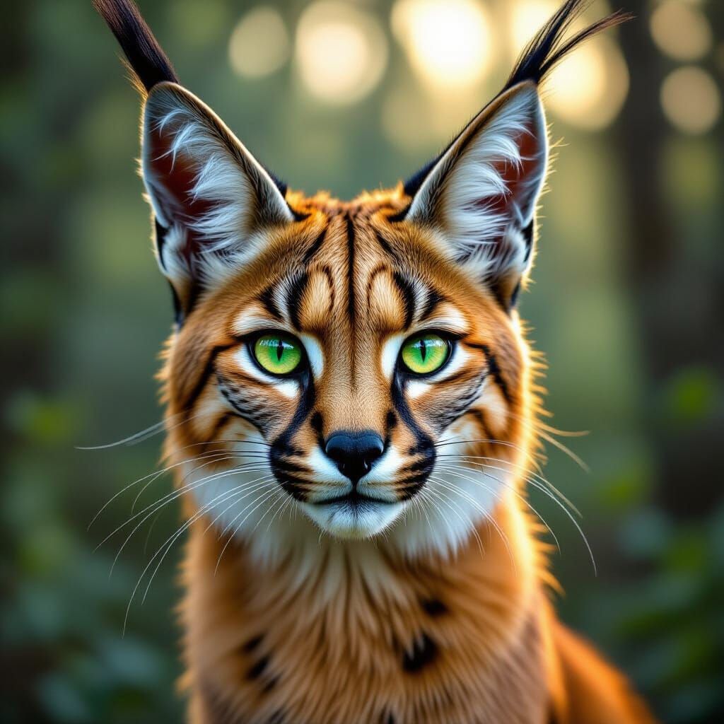 This image shows a caracal with striking green eyes and black ear tufts, its golden fur illuminated by ethereal lighting. The backdrop suggests a blurred forest, in a cinematic wildlife photography style.