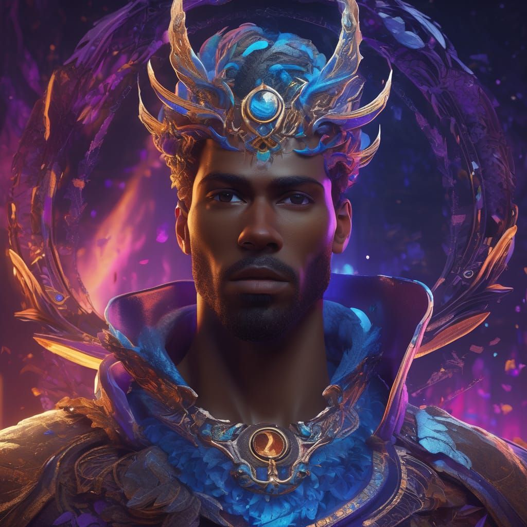 Fantasy concept art featuring a confident, deep-toned man with glistening skin. A swirling nebula of bioluminescent blues and purples creates a fantastical backdrop. Intricate detail and a proud jawline define this striking portrait.