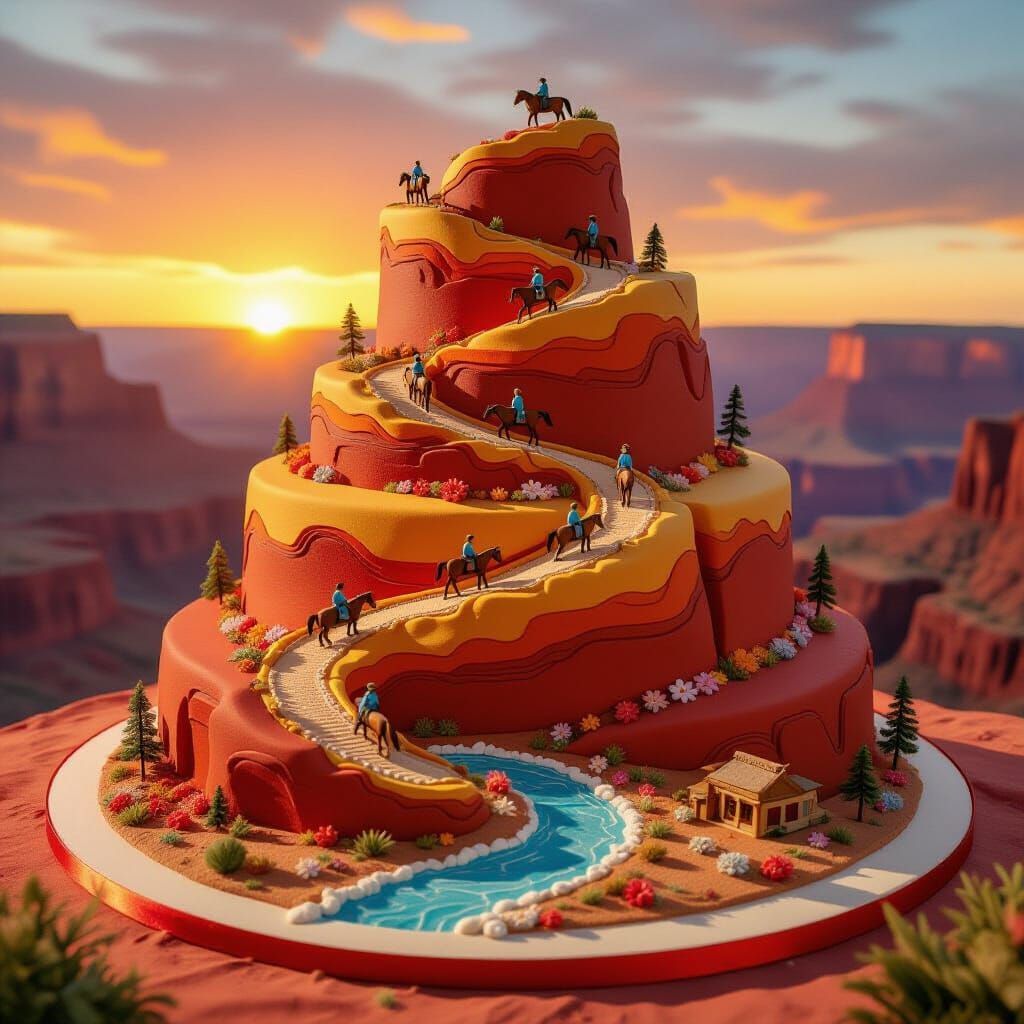 This hyperrealistic cake sculpture depicts an 8-tier fondant canyon with hiking trails, horses, and a river. Features desert sunset colors and exquisite floral details.