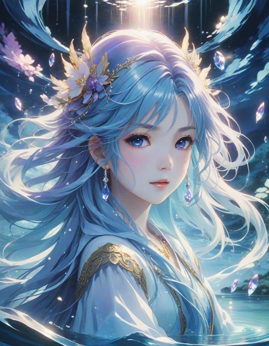 A captivating anime portrait of a water spirit rising from a pond. The artwork features cel-shading, crystal jewelry, and a color palette of deep blues and purples in a Kyoto Animation style.