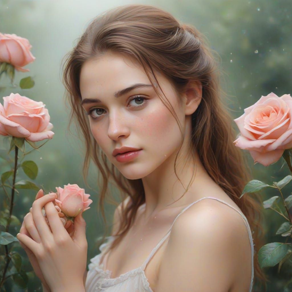 This image captures a beautiful young woman in a head and shoulders portrait, gently picking roses. It features delicate petals, dew drops, and soft pastel colors in a romantic, watercolor aesthetic.