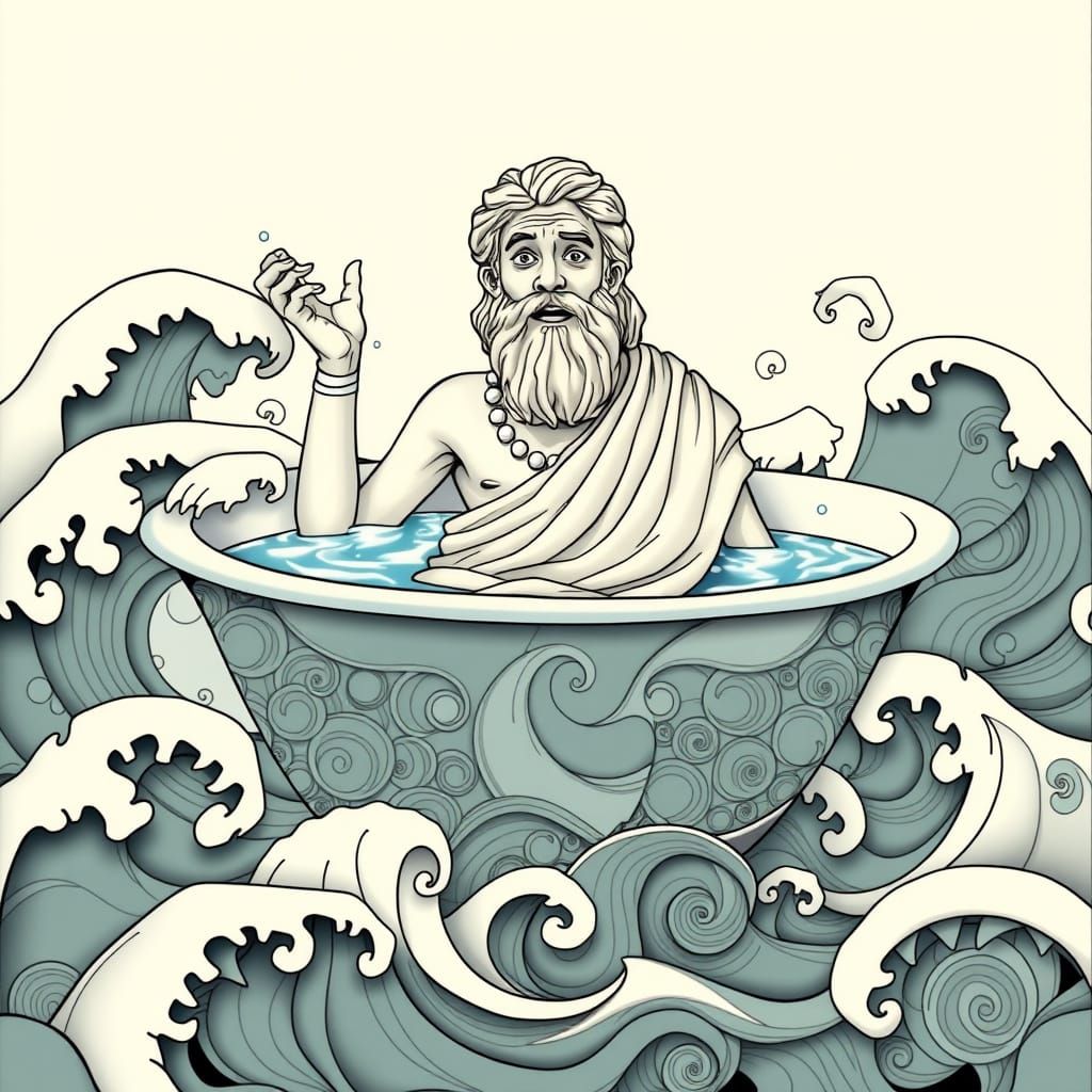 A vector art print depicting Archimedes in a bathtub, exclaiming Eureka. The image blends Zentangle patterns and geometric art with 3D shading, creating a dynamic visual experience.