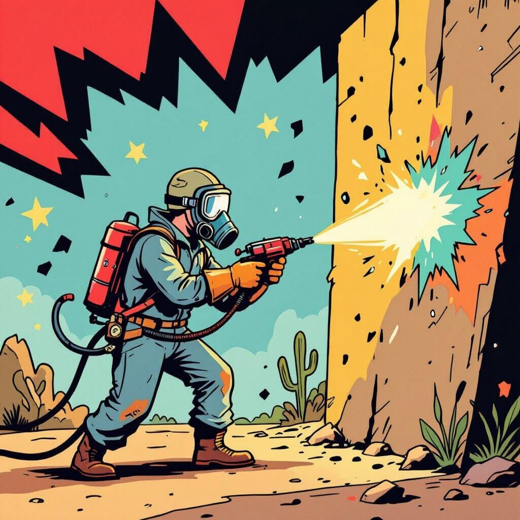 This image shows a person in a jumpsuit and mask sandblasting a surface. The illustration is in a vibrant cartoon style, with bold lines, exaggerated textures, and dynamic colors.