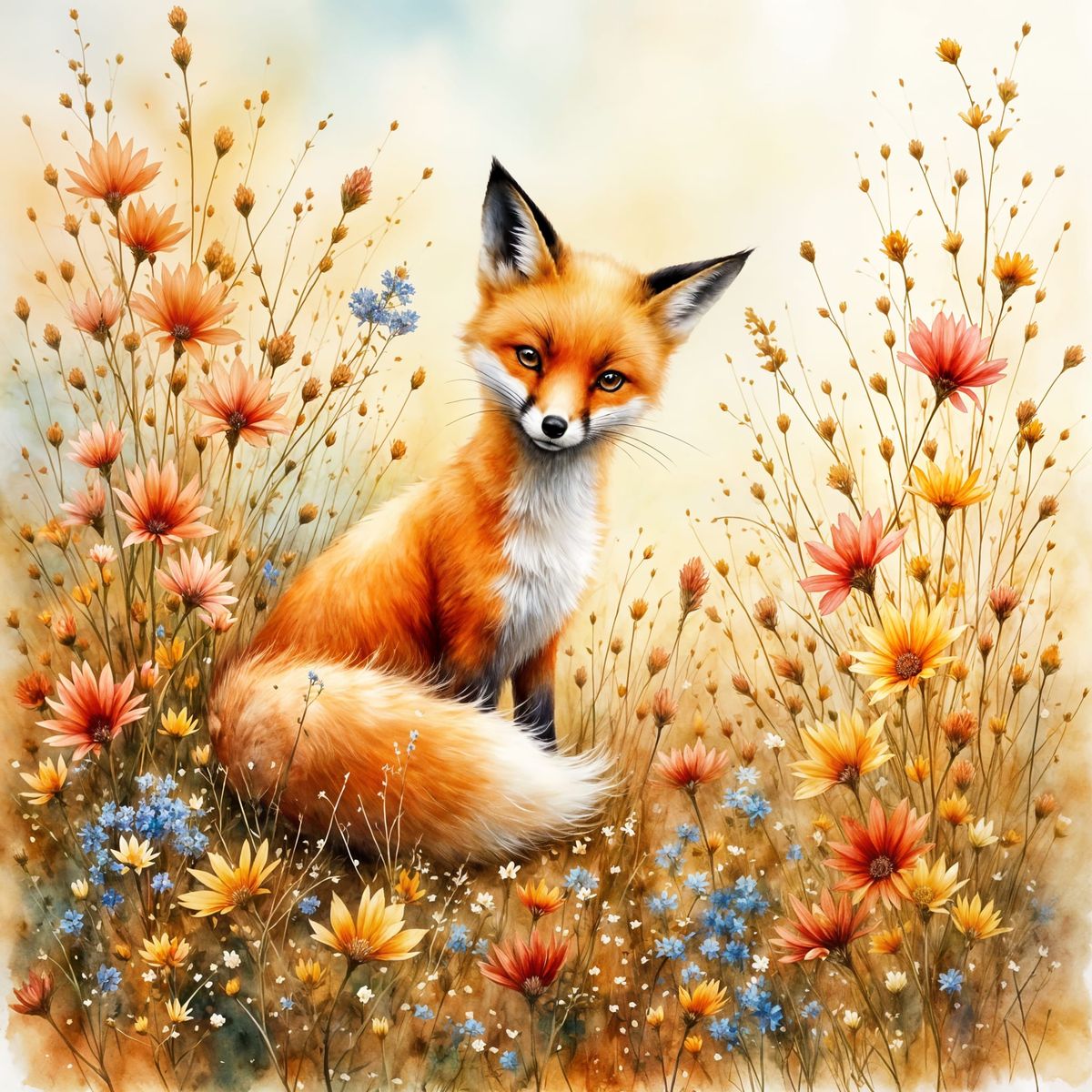 A young fox peeks out from a bed of wildflowers, brambles, and browning grass. The scene captures the subtle beauty of autumn colors, rendered with ink and light watercolor.