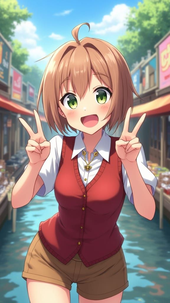 This image shows a cheerful anime girl with light-brown hair in a lively market square. She is wearing a white blouse, red vest and brown shorts, rendered with sharp focus and detailed backgrounds in a manga style.