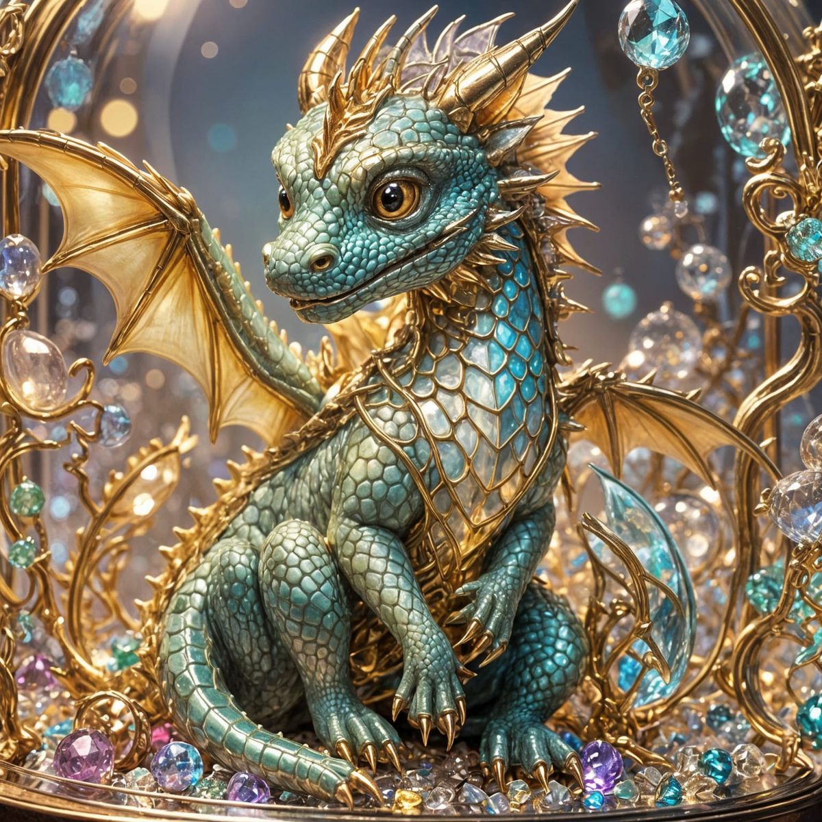 This image shows a tiny, adorable baby dragon nestled inside a glass jewelry box. The box is filled with shimmering, illuminated glass jewelry, creating a magical scene.