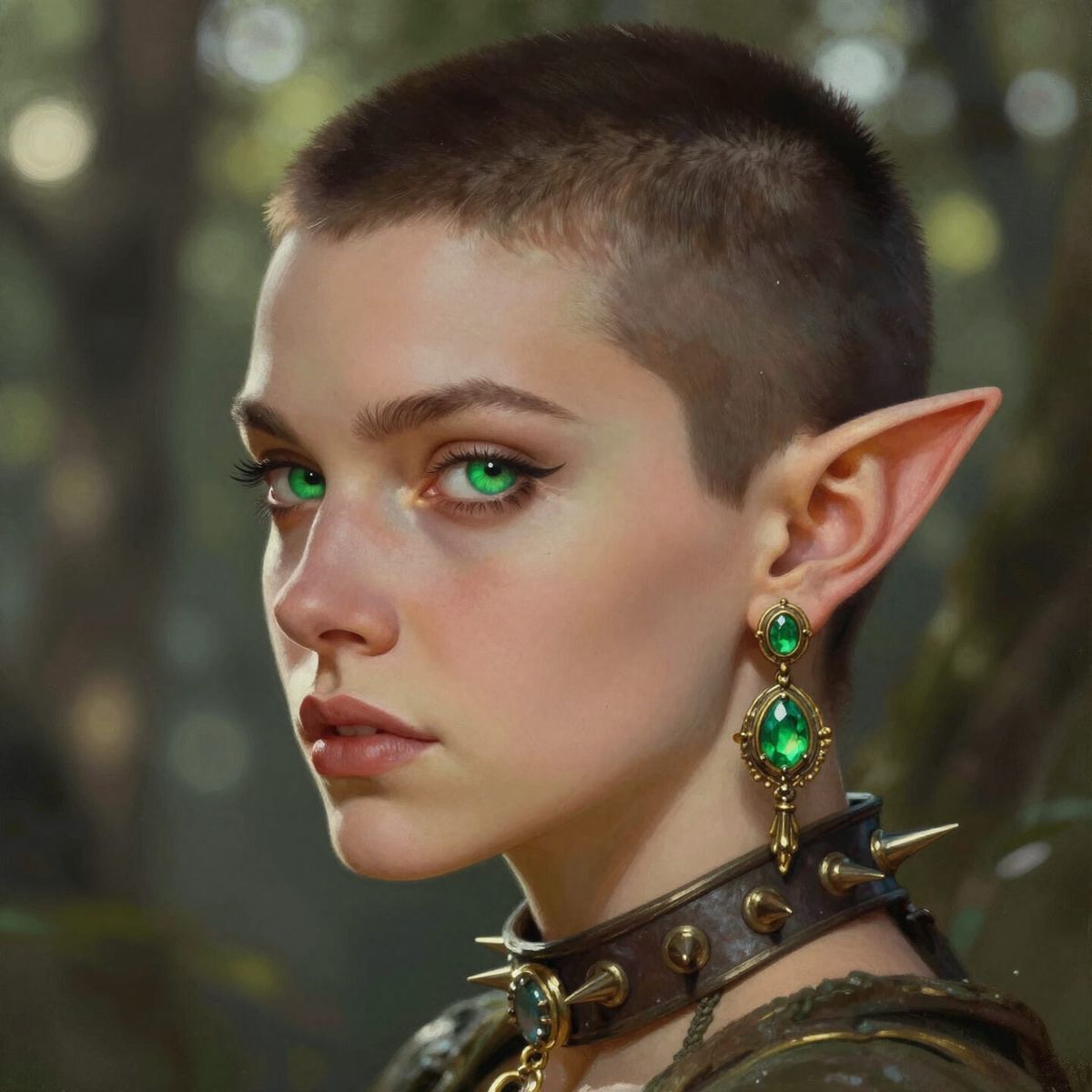 A hyperrealistic digital painting of an elf with vivid green eyes, showcasing intricate baroque earrings and a spiked collar. Dappled sunlight creates a cinematic mood.
