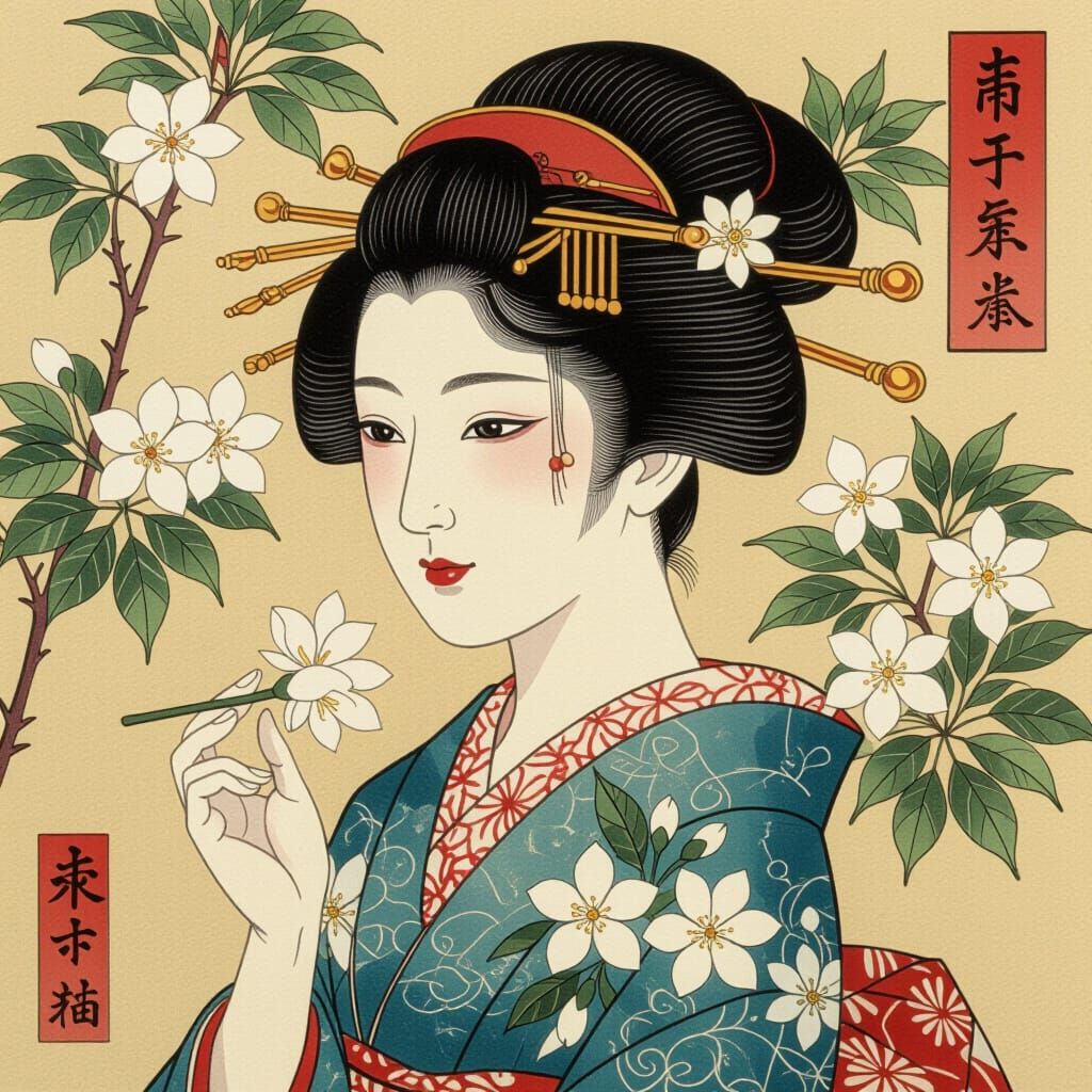 A beautiful Ukiyo-e style image evoking sweet perfume memories. The artwork captures Japanese aesthetic beauty and delicate jasmine blossoms in graphite and oil.