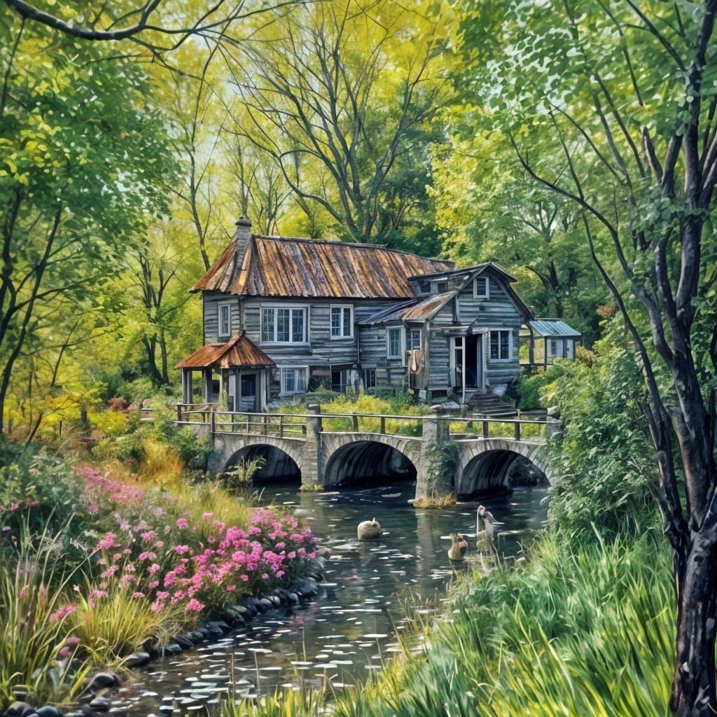 A striking picture of a quaint cottage with a waterwheel set in a magical meadow surrounded by woods. The image features hyper-textured brushstrokes and charcoal grunge textures in a modern, painterly style.