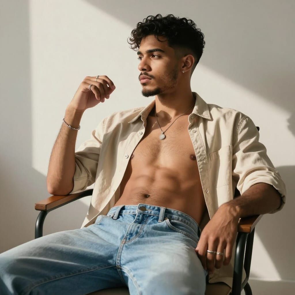 This image features a young Kreol man seated confidently, wearing an unbuttoned beige shirt and blue jeans. He has a lean, athletic physique and a thoughtful gaze.