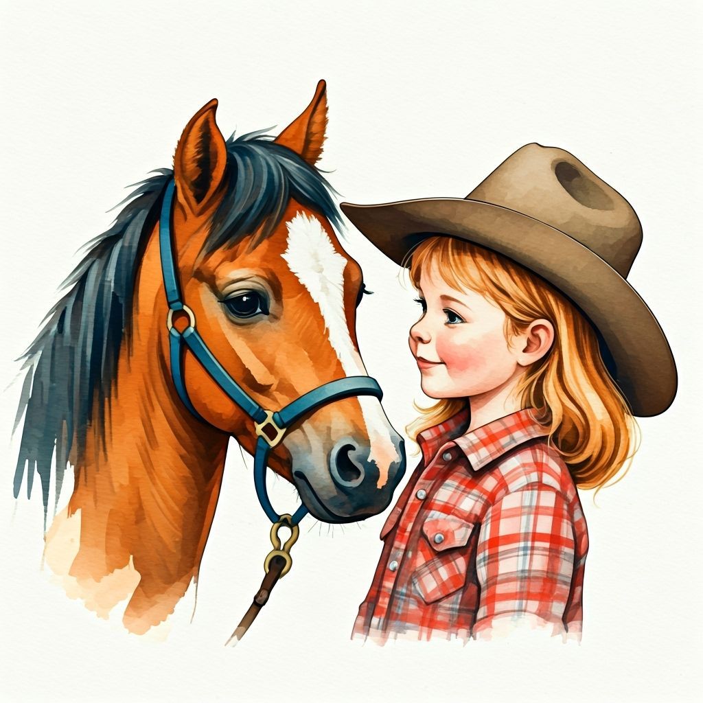 A close-up watercolor portrait of a little cowgirl, face to face with her pony. This heartwarming image captures a tender moment with soft textures and a whimsical, storytelling aesthetic.