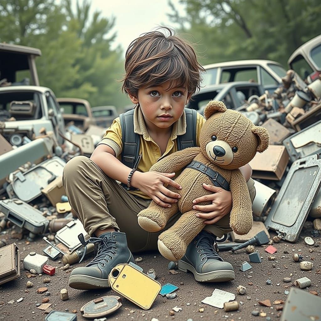 This image depicts a 10-year-old boy with messy hair, clutching a worn teddy bear found in a dystopian junkyard. The scene uses natural lighting and dulled, natural colors to create a salvagecore aesthetic.