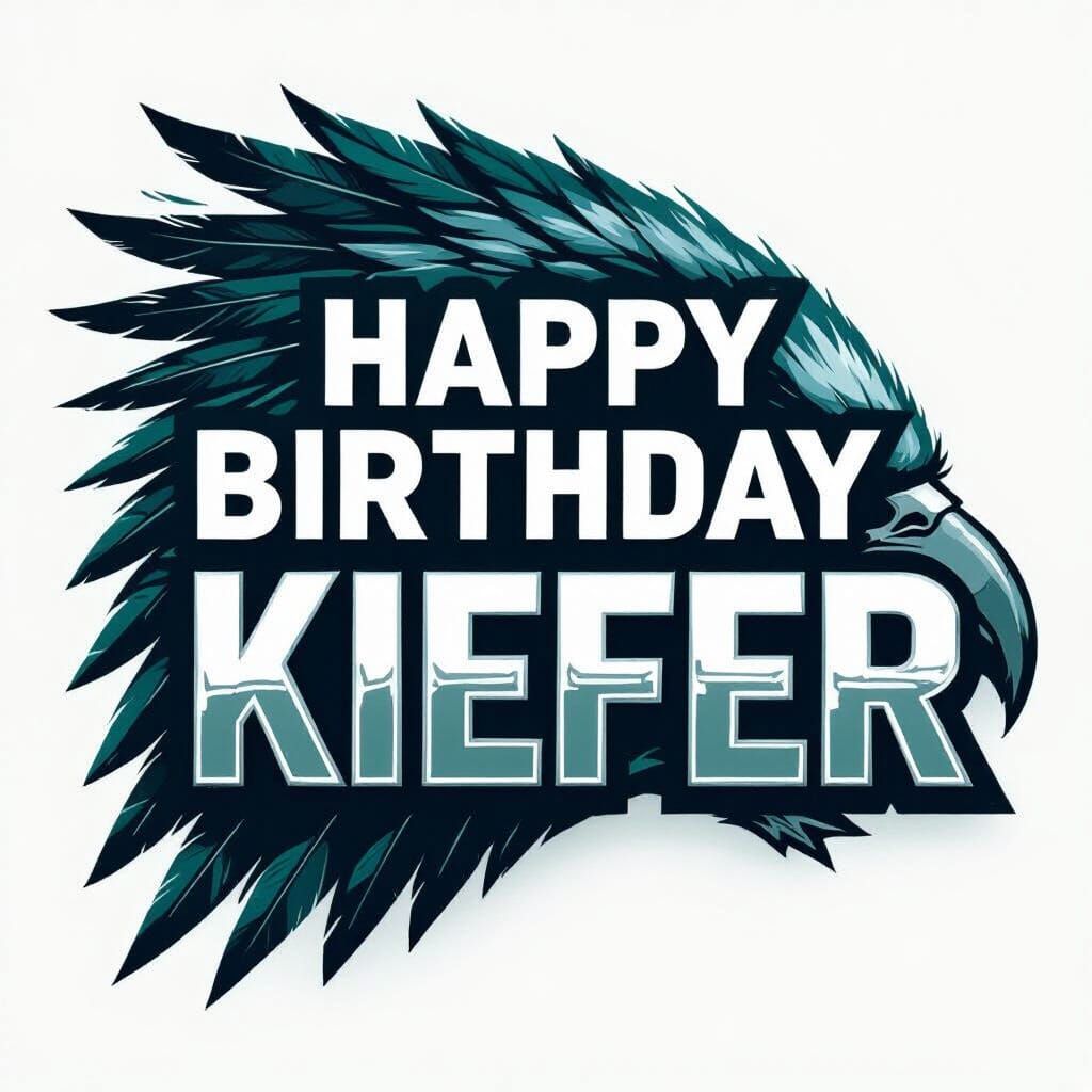 A digital rendering of the Philadelphia Eagles logo wishing Kiefer a happy birthday. The logo features midnight green and silver feathers with a modern, futuristic aesthetic.