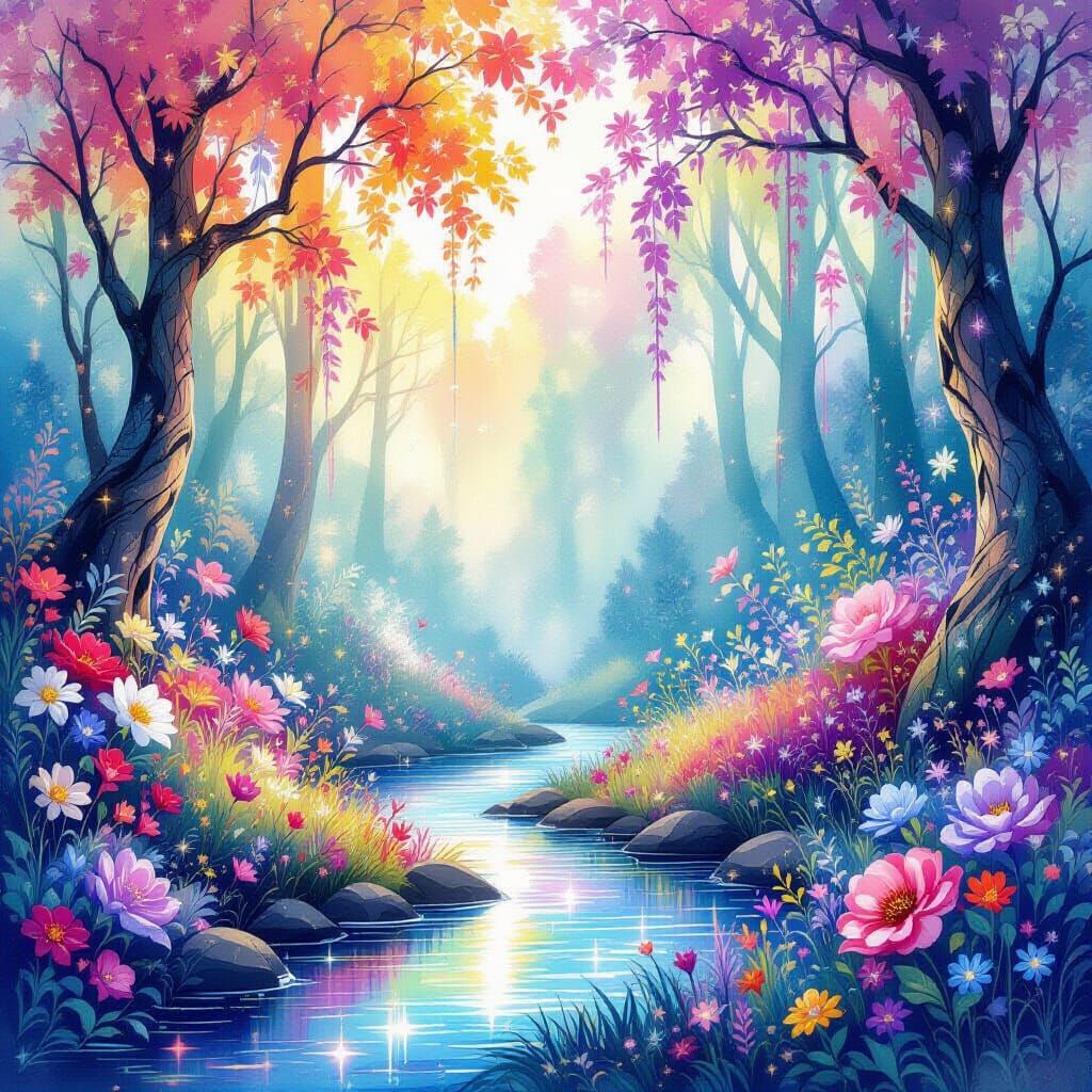 A vibrant, dreamlike fantasy painting featuring swirling rainbow colors, magical aura, and sparkling light effects. Inspired by intricate watercolor and ink wash styles.