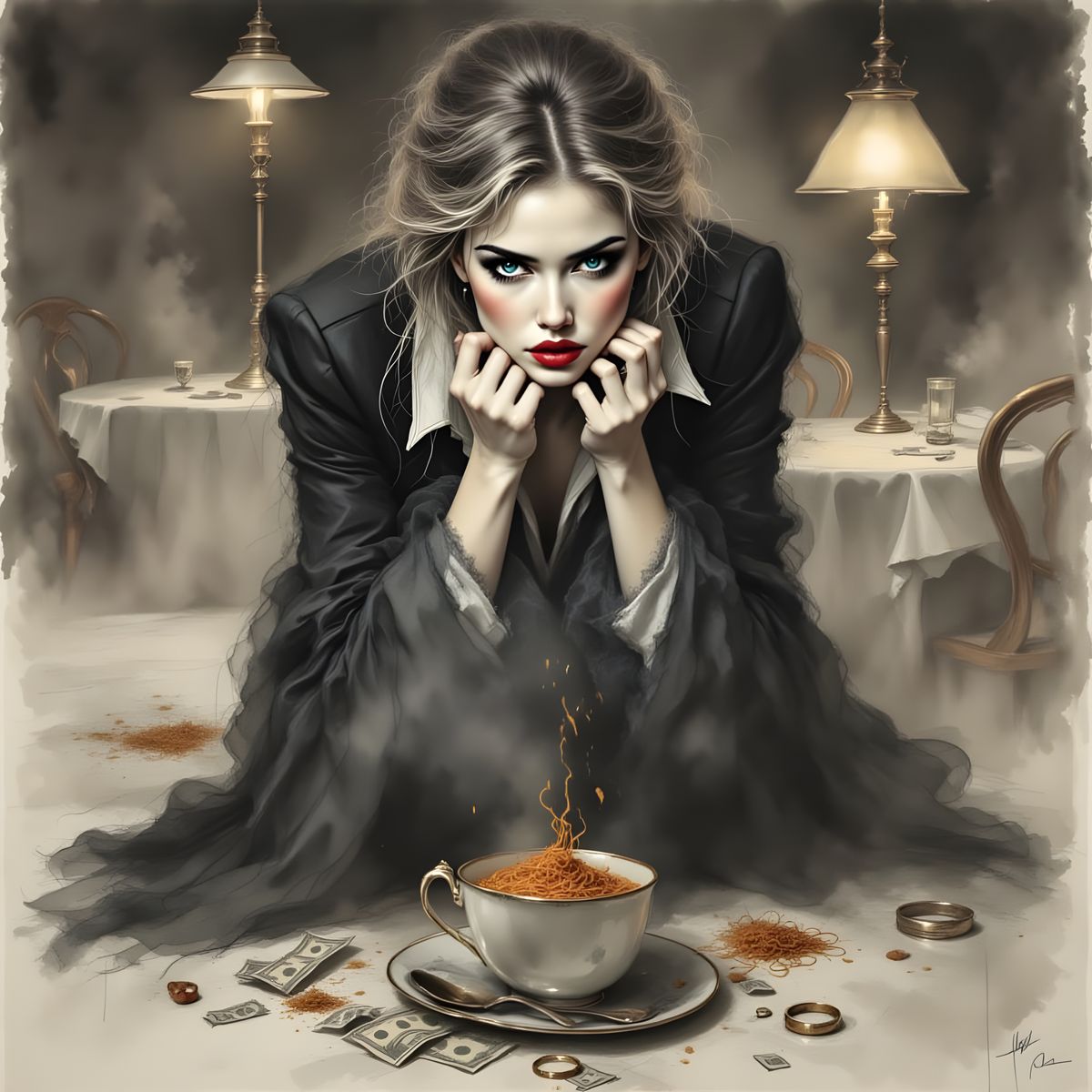 This image depicts a pensive figure rendered in a style blending charcoal and antique watercolor techniques, evoking feelings of uncertainty and concern.