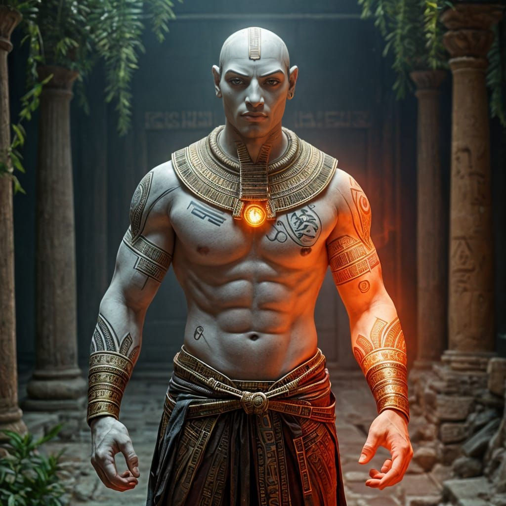 This image shows a marble-skinned humanoid casting a spell. Runes and glyphs cover his body, with glowing symbols indicating magical activation. He wears a gold pharaoh-like necklace and tunic.