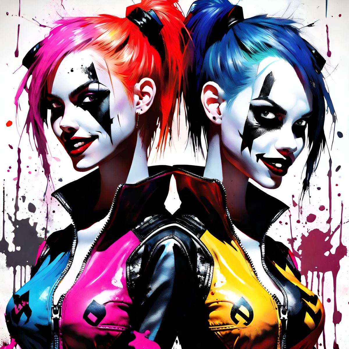 This image shows Jinx and Harley Quinn in tight latex outfits. The punk anarchy girls are depicted in a colorful, high-contrast splash art style reminiscent of oil gouache painting.