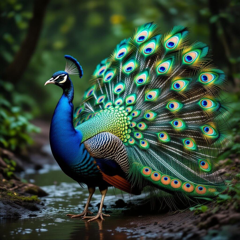 A magnificent peacock with a shimmering blue breast and fanned tail feathers stands by a forest stream. Its plumage displays vibrant jewel tones and intricate eye patterns, catching filtered sunlight.