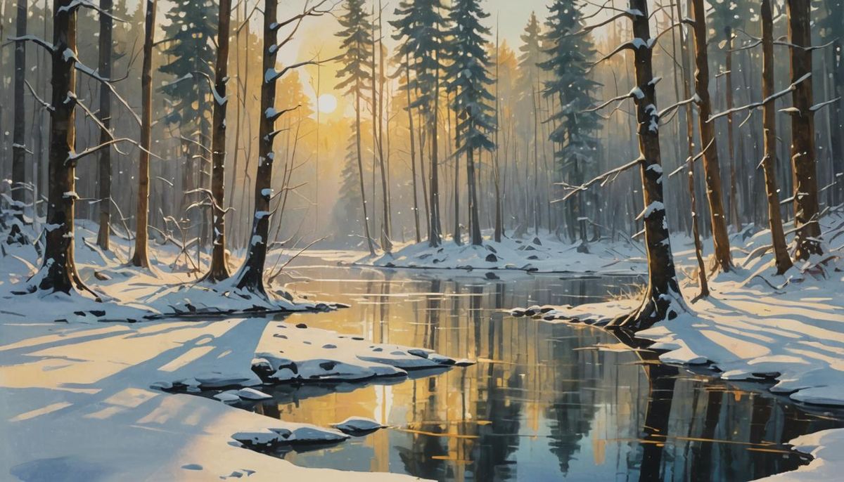 A serene frozen lake scene in a dense snowy forest is depicted in this gouache painting. Soft golden sunlight and long shadows enhance the dreamy, photorealistic, impressionist aesthetic.