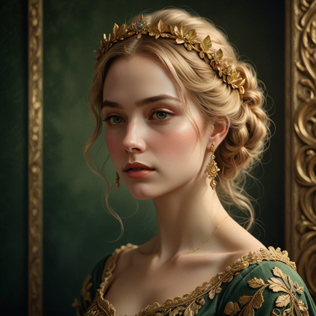 This image is a Renaissance-inspired portrait of a beautiful woman with a stunning golden laurel wreath and intricate off-shoulder dress, set against a dark green background with soft shadows and warm, golden lighting.