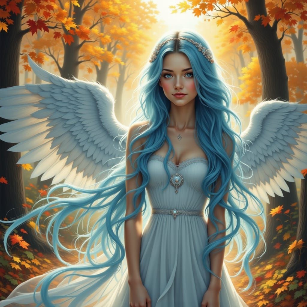 This image shows a beautiful, 25-year-old princess with long blue hair and angel wings. She wears a long white gown and stands near autumn trees, bathed in sunlight, in a whimsical and colorful scene.