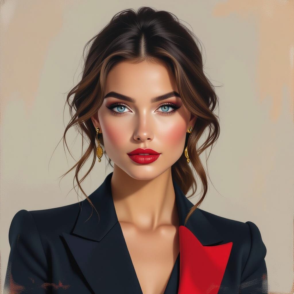 A striking close-up portrait of a confident young woman with piercing blue eyes. The image is rendered as an ultra-realistic oil painting, with dynamic color blocks and dramatic lighting.