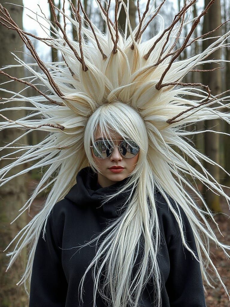 she's hollow mirrors on nature mock her embodied ivory-white hair like scaffolding holds a series of recursive wild mirrors climbing up and around her bunched hair-strands in layered hollowness reflecting the futility of right now pull back into a wide angle wild angle full-length long shot mirroring ...