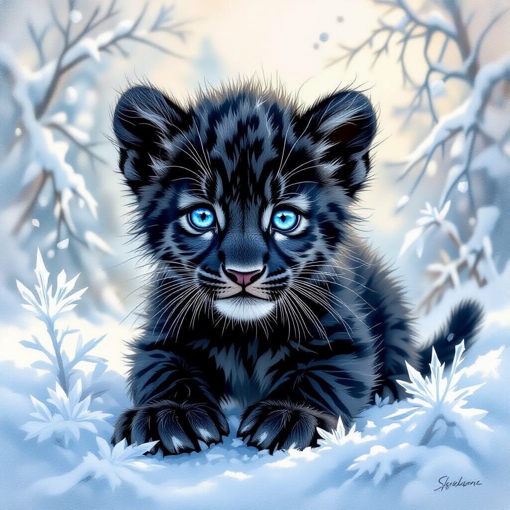 This image shows a panther cub with striking blue eyes and glossy black fur, surrounded by ice crystals. The artwork has a whimsical, realistic style in soft pastel watercolor.