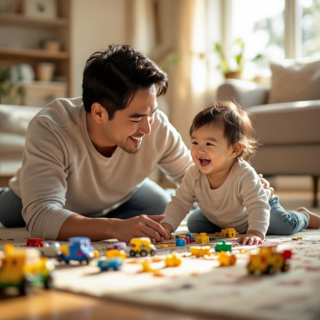 This image shows a Filipino father and his toddler sharing a happy moment on the living room floor, surrounded by toys. Natural light creates a warm, cinematic atmosphere, captured in photorealistic detail.