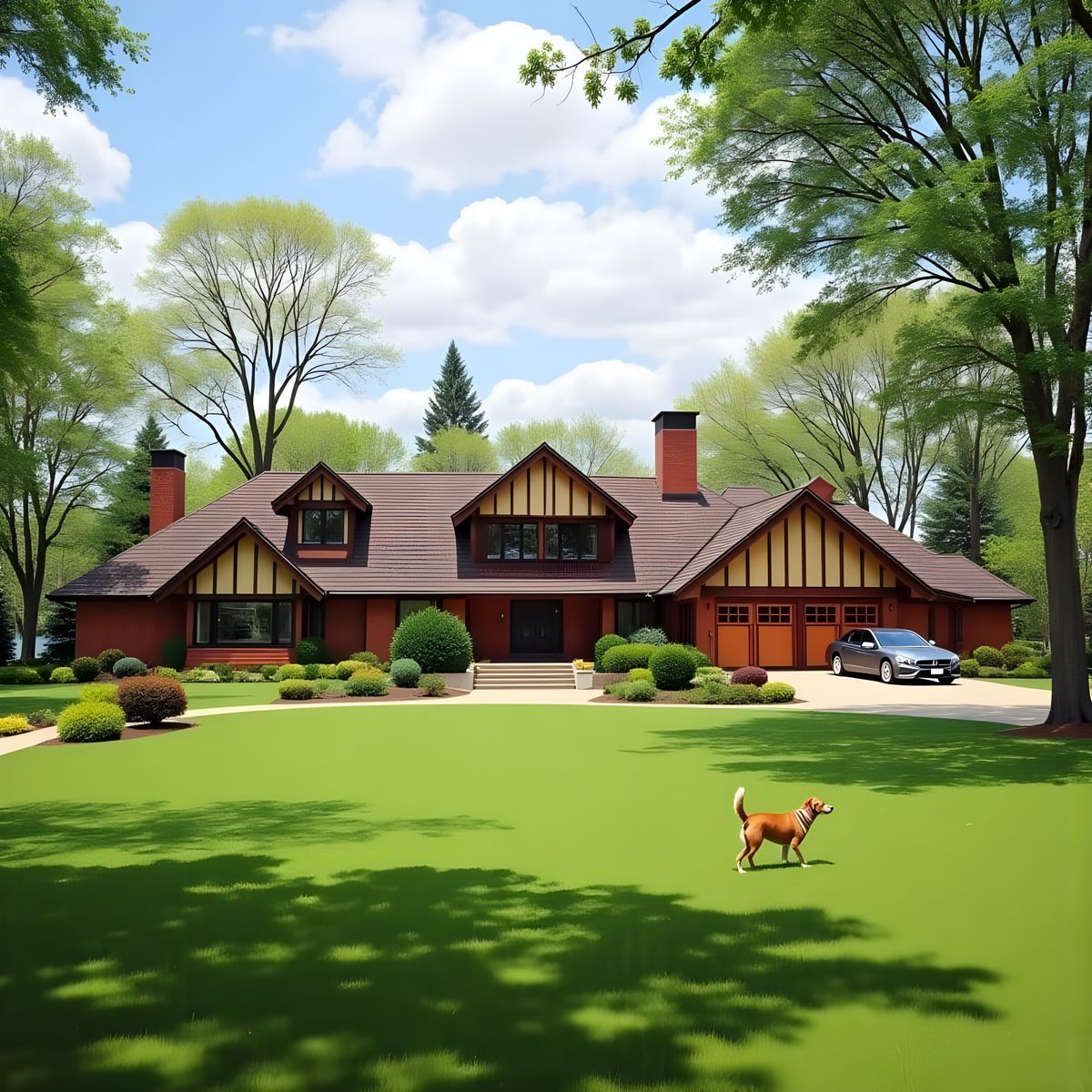This image shows a grand, wide horizontal home blending Prairie style with Tudor influences, evoking a sense of luxury on a half-acre estate.