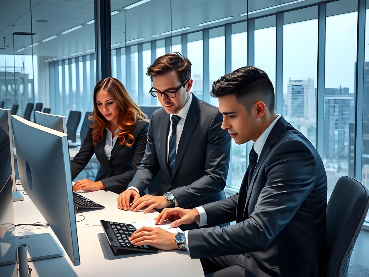 A group of professionals collaborate in a modern office setting. The image features futuristic and minimalist aesthetics, reminiscent of digital artwork with clean lines and vibrant city views.