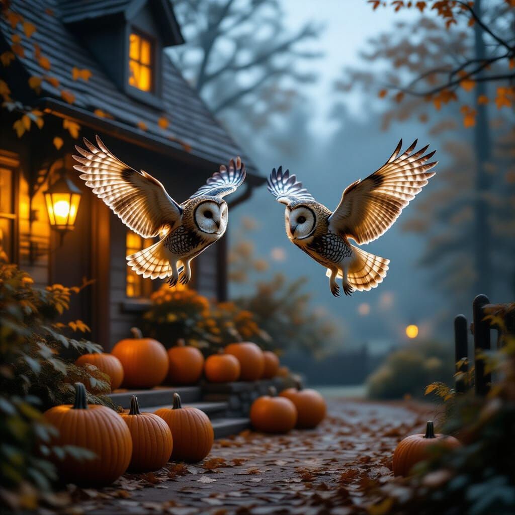 This image shows two adorable owls flying over a quaint cottage on a cozy autumn night. Pumpkins and lanterns glow softly in the gentle mist, creating a magical atmosphere.