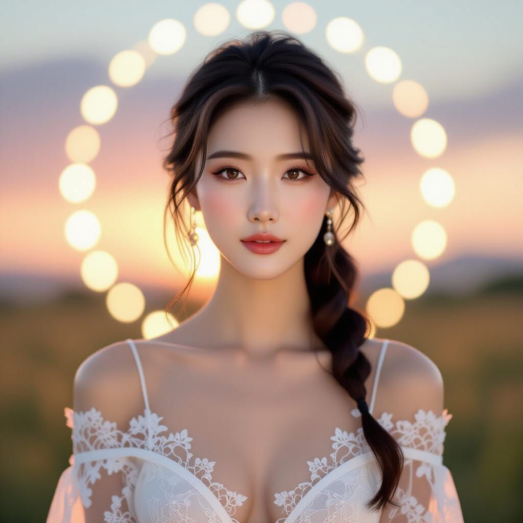This image shows a beautiful Korean woman with porcelain skin in a sheer lace wrap, illuminated by dawn light. Rendered in a hyperrealistic digital painting style with soft pastels, inspired by classical portraiture.