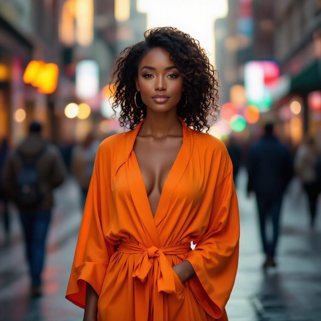 A photorealistic portrait of a Black woman in vibrant orange robes bathed in golden hour light on a bustling city street. Features glowing skin, detailed fabric, and a dynamic urban background with neon lights.