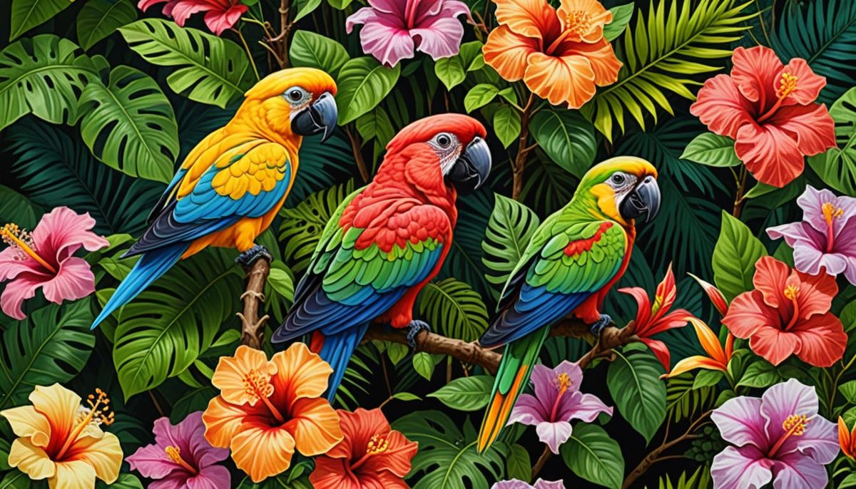 This image showcases a lush tropical rainforest bursting with colorful flowers like hibiscus, orchids, and bougainvillea, along with vibrant exotic parrots perched on branches.