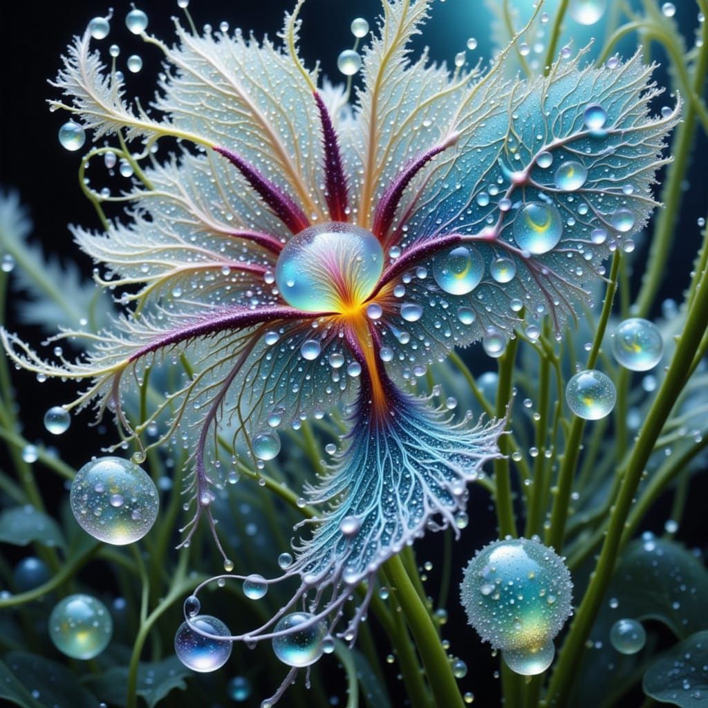 This image shows an intricate, stylized flower with complex tendrils and opalescent dewdrops filled with blue and green microbes. It features scientific detailing and patterned tracery reminiscent of ethereal realism and fractal intricacy.