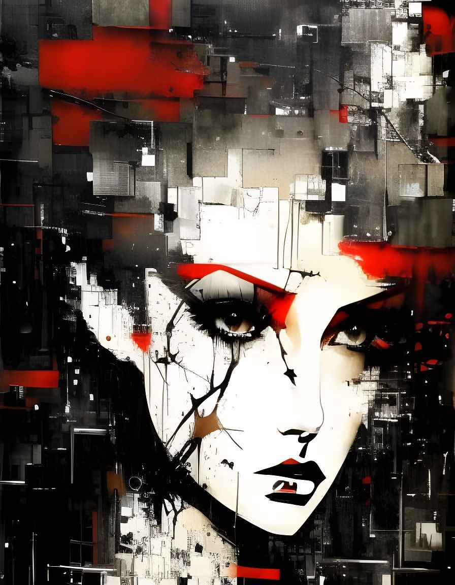This image features a striking portrait of a beautiful woman, rendered in a dynamic, sketchy artistic style reminiscent of traditional illustration.
