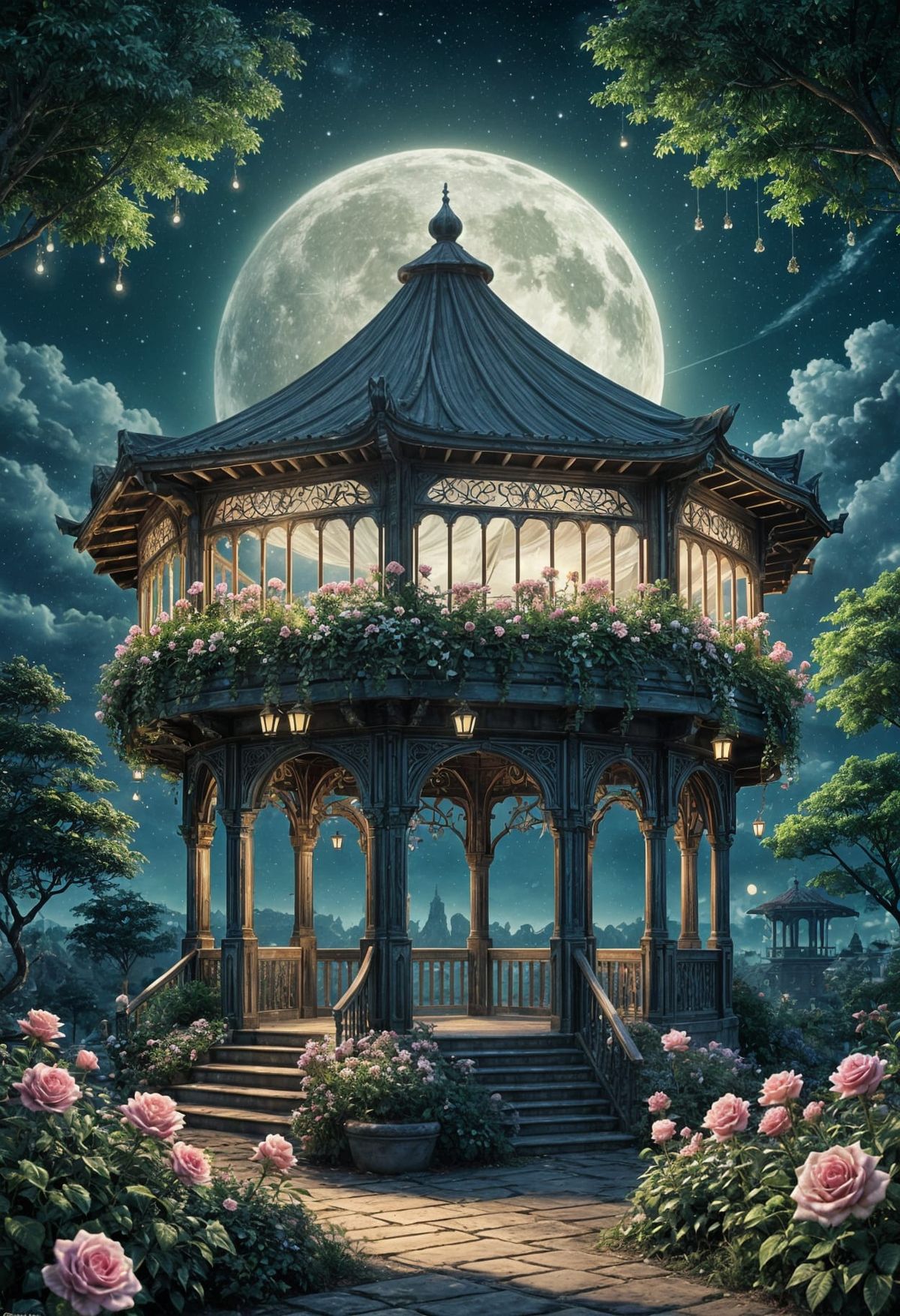 A photorealistic image of a cyberpunk rose gazebo illuminated by glowing string lights under a starry, moonlit sky. Features cinematic lighting and an ethereal, futuristic aesthetic.