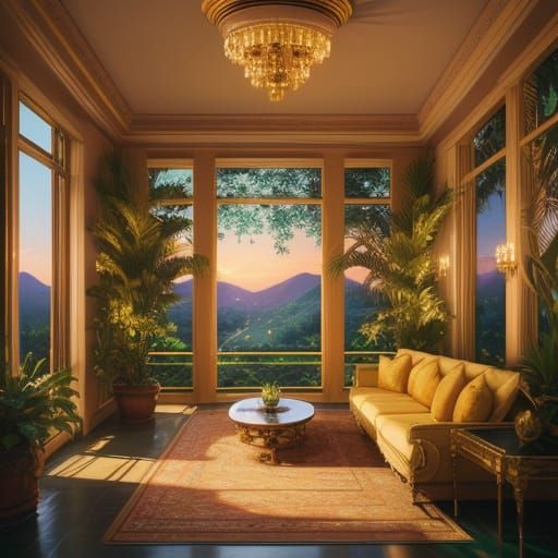 This stunning image captures a luxurious resort villa mansion's sunroom, overlooking a lush hilltop blanketed in vibrant spring flowers, bathed in soft warm golden lighting, with delicate petals swaying in the breeze and string lights twinkling like fireflies.