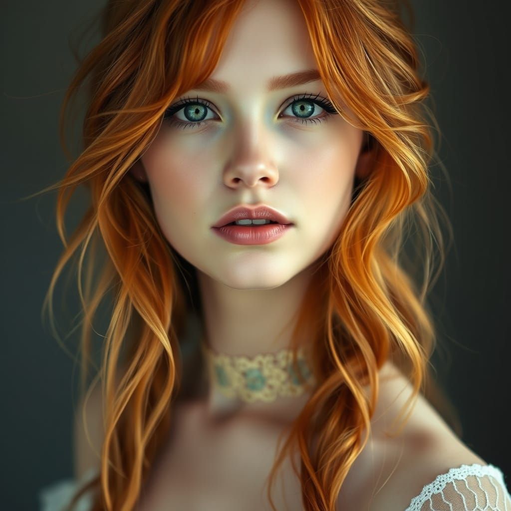 This captivating portrait features a young woman with wavy red hair and striking green eyes, adorned with delicate lace and exuding elegance and mystique, reminiscent of Old Master paintings and modern-day photography legends.