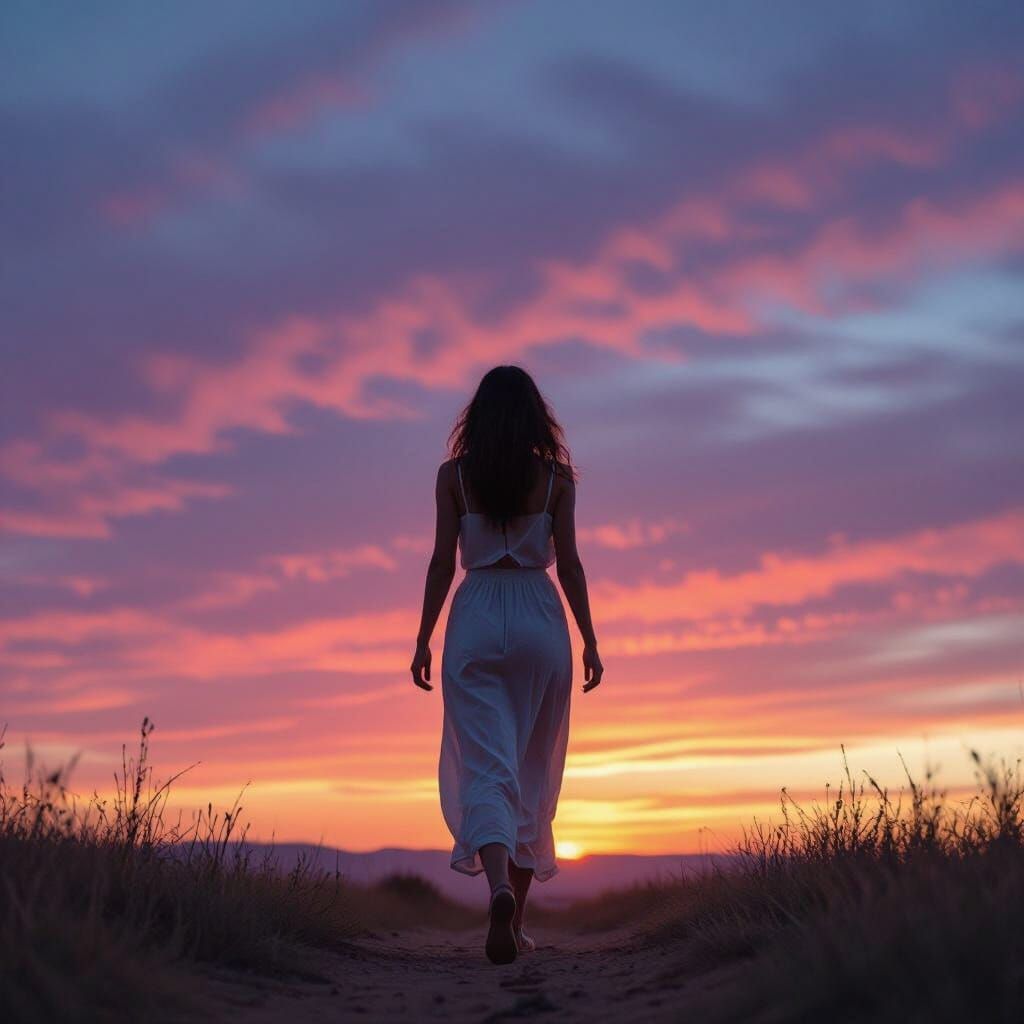 A woman walks toward a sunset painted in vibrant shades of orange, purple and pink. The scene evokes cinematic realism with film grain and a vignette effect.