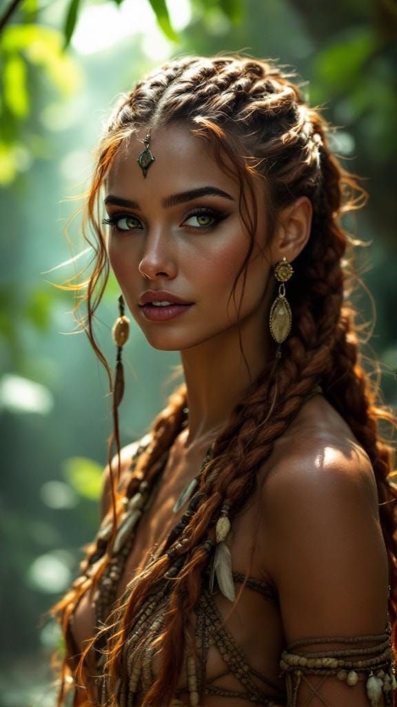 This image shows a beautiful woman with braided auburn hair in a tribal outfit, set against a lush rainforest backdrop. Dappled sunlight filters through the canopy, enhancing the exotic and earthy style reminiscent of National Geographic photography.