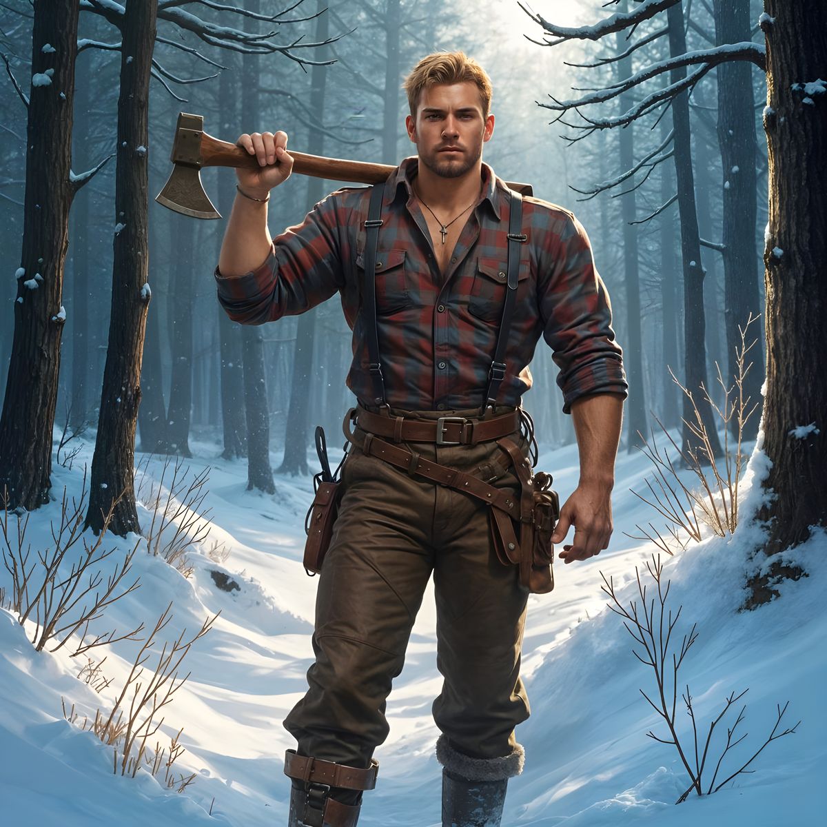 This image shows a blond, muscular lumberjack standing in a snowy forest. He is shirtless, wearing leather pants, and holding an axe. The digital painting features cool colors and intricate, hyperrealistic details.