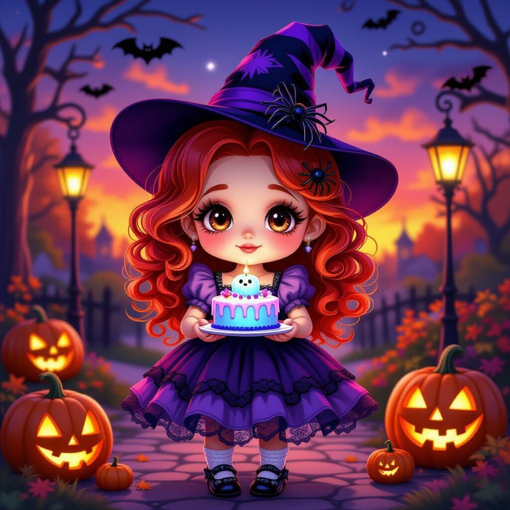 This AI-generated image features a cute chibi baby in a fluffy purple and black lace dress, holding a glowing cake. The scene is a haunted autumn garden at sunset with neon lighting.