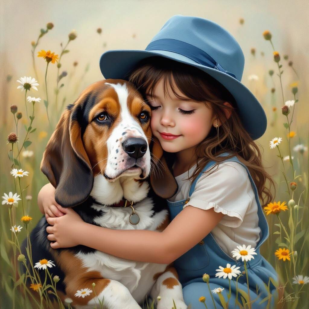 This image shows a young girl embracing a Basset Hound, surrounded by wildflowers. Rendered in a tonalist oil painting style with HDR, it evokes emotional naturalism and intimate lighting.
