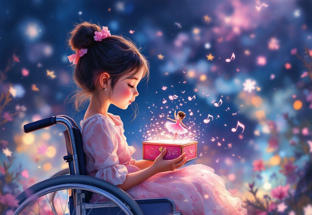 This image shows a pretty little girl in a wheelchair gazing with love at a music box. Swirling musical notes enhance the watercolor and acrylic scene, rendered with hyperrealistic facial features.