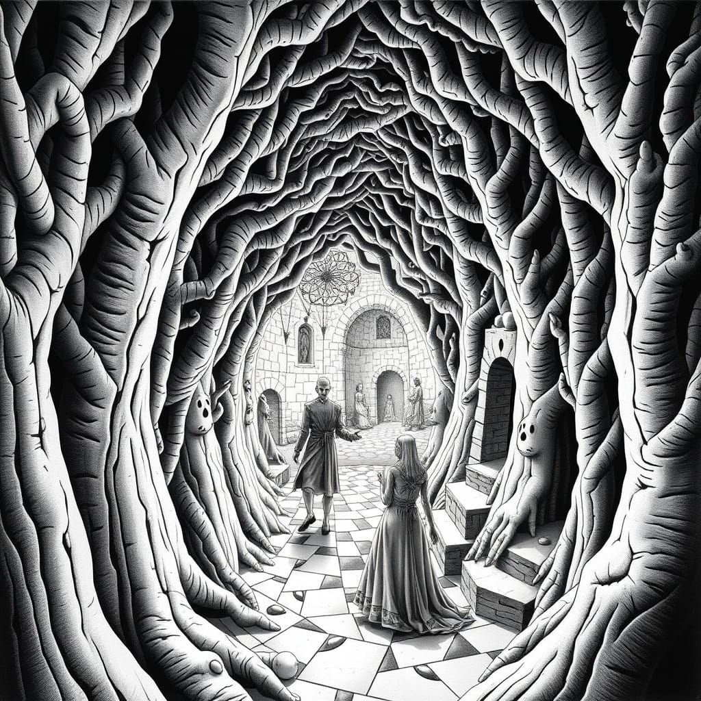 This image shows a psychedelic black and white maze in the style of M.C. Escher, featuring women in the vibrant and dynamic style of Guido Crepax