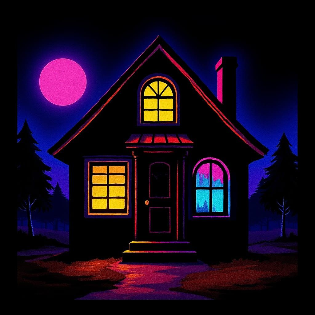 A quaint prairie house is depicted with vibrant neon colors and quilled paper-like details. The image is rendered in a film noir aesthetic with dramatic shadows and bold lines.