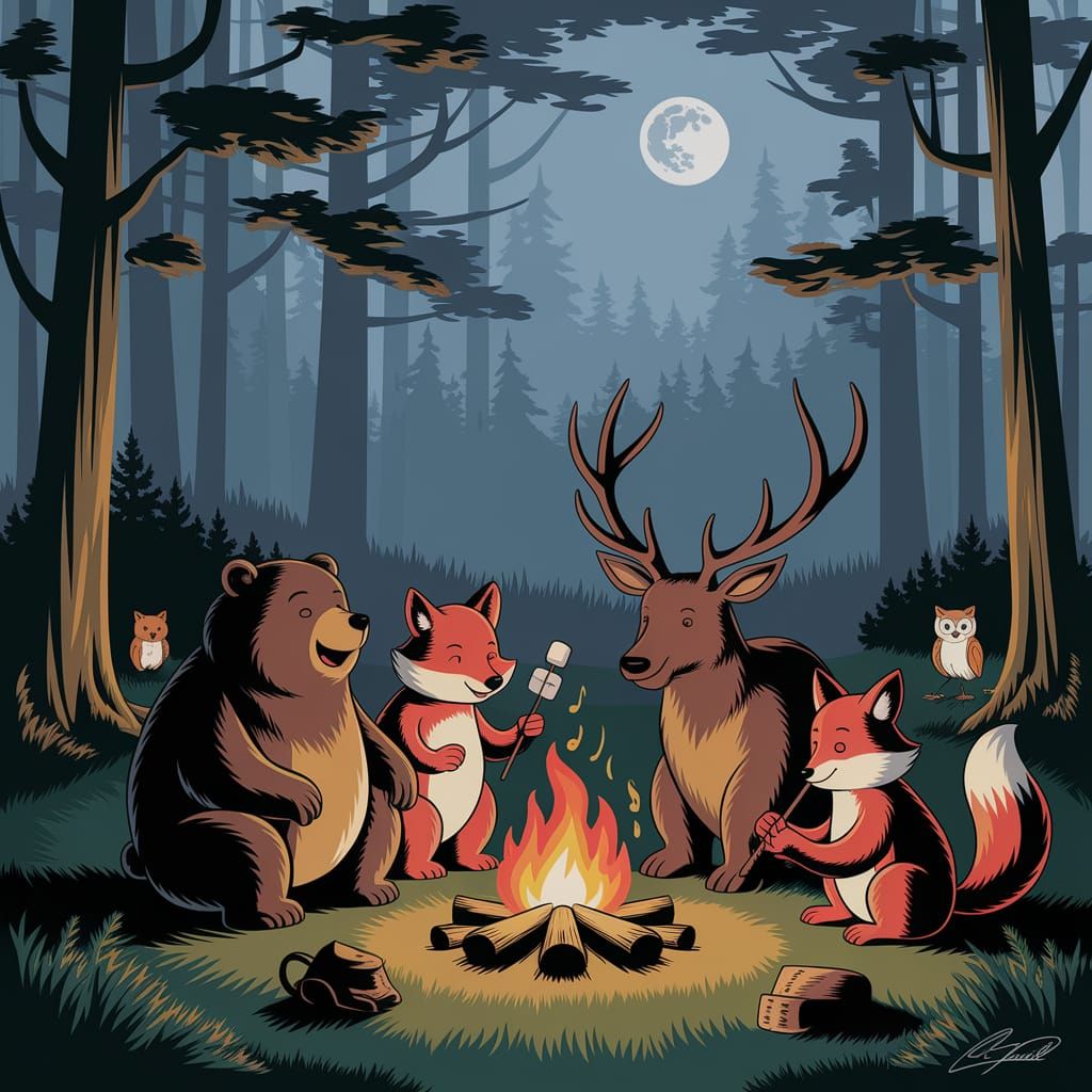 This image shows a clearing in a misty forest at night, where woodland creatures gather around a campfire. A bear, elk, fox, and owl share stories and roast marshmallows in the fire's warm glow.