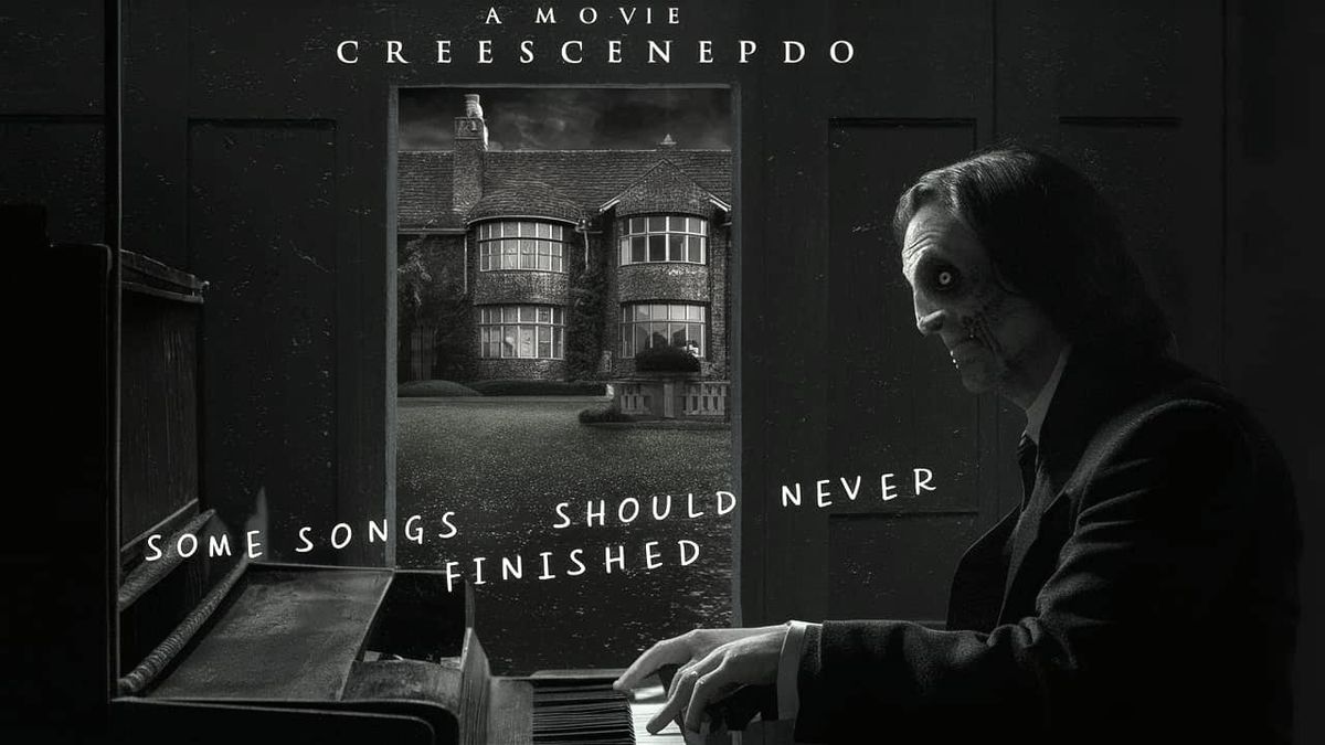 A dramatic movie poster featuring a sinister-looking man playing a piano in a dimly lit, old British home. The tagline reads, "Some songs should never be finished."